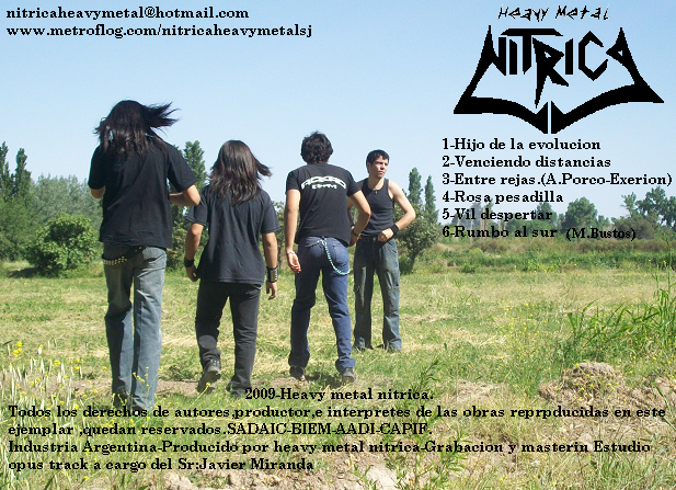 Nitrica Heavy Metal proviene de San Juan sumando fuerzas a la hermosa región de Cuyo donde allí, el metal también tiene su movimiento. Formados en mayo de 2009 por el amigo Fernando Falcon (Guitarra – ex - Arte Infernal), Nitrica se encamina entonces por la senda de nuestro argento metal con la pasión y sentimiento que esto implica. Así unirían sus voluntades junto a Fernando entonces Federico Tomasinni (bajo) , Mario Castro ( voz) , Pablo Barcena (batería) . De esta manera graban este su primer demo de 6 temas (4 en estudio y 2 en vivo) de nombre homónimo. Este primer registro inicia con “Hijos de la evolución”, con sonido metal argento, un riff con gancho desde el comienzo y que será quien marcara identidad la mayor parte del tema, buena intervención de la batería en la parte media del track y la voz de Mario Castro que tiene tintes Black Metal dando un espectro de oscuridad, atmósferas y que, en combinación con lo antes mencionado queda muy logrado. “Venciendo Distancias” comienza con una melodía de guitarra bajo un efecto pedal, algo de delay también, y que sirve de antesala para desembocar luego en un riff muy heavy, muy clásico, en donde Mario utiliza en ocasiones voces limpias también. El tema numero tres es “Entre Rejas” el cual, nos contaba Fernando, tiene letra de Ángel Horacio Porco (Exerion – Angel) quien es un amigo de la banda, hablando de cómo el metalero es perseguido, mal visto y marginado por la milicada. Un buen tema y mucha fuerza transmitida en las bases bata y bajo. “Rosa Pesadilla” es un tema que tiene altos y bajos, arranques y cortes, Fernando comienza con uno de esos riff de Speed/Thrash ochenteno, de arranque demoledor, luego se levanta el pie del acelerador y llega a un corte, y es aquí entonces cuando Federico Tomasinni trabaja con su bajo mientras Fernando hace arreglos justos sobre esta base densa, Castro vocifera gurutalemente la palabra…”despertar” cuando al mimo tiempo se ríe y el tema toma por unos instantes una transición que va acorde a la letra, que habla de lo que es pasar por excesos y como nos cuesta dejarlos aun sabiendo que nos están destruyendo, de eso se trata la locura de rosa pesadilla, presten atención y escuchen bien. El demo se completa con dos temas en vivo, “Vil Despertar” que vendría a ser la continuación de “Rosa Pesadilla” y “Rumbo al Sur” dedicada al hermoso pueblo 25 de Mayo ubicado al Sureste de la provincia. Hoy en los tambores esta Eduardo Fernández quien reemplazara a Pablo Barcena tras su alejamiento. De inmenso corazón son estos fieles metaleros sanjuaninos que hacen volar tu imaginación con su música cargada de rica expresión metalera, de esas increíbles tierras en donde los campos muestran plantaciones de vid y olivos, paisajes como los que la banda muestra en la portada del demo, y tanta historia legendaria de esa hermosa región. Muchas gracias amigos por habernos hecho llegar a Nitrica Heavy Metal a Oscuro Funeral Web y a nuestra querida provincia de Córdoba, así debemos unir al país. “Que caigan las cabezas de aquellos que solo les importa su bienestar”….(Hijos de la Evolución) Para mas contactos: nitricaheavymetal@hotmail.com Metroflog: http://www.metroflog.com/nitricaheavymetalsj http://www.metalerosdemendoza.com.ar/1_39_Nitrica.html Fabio |